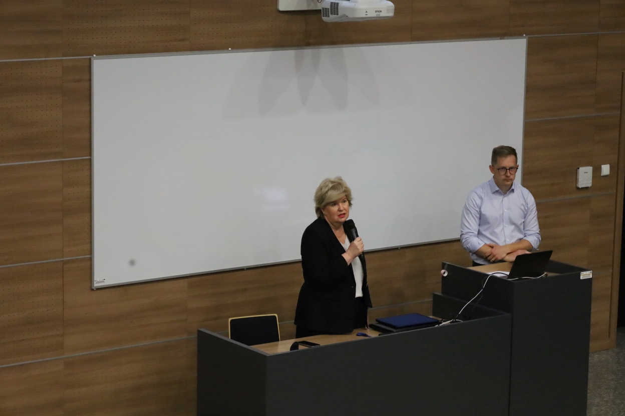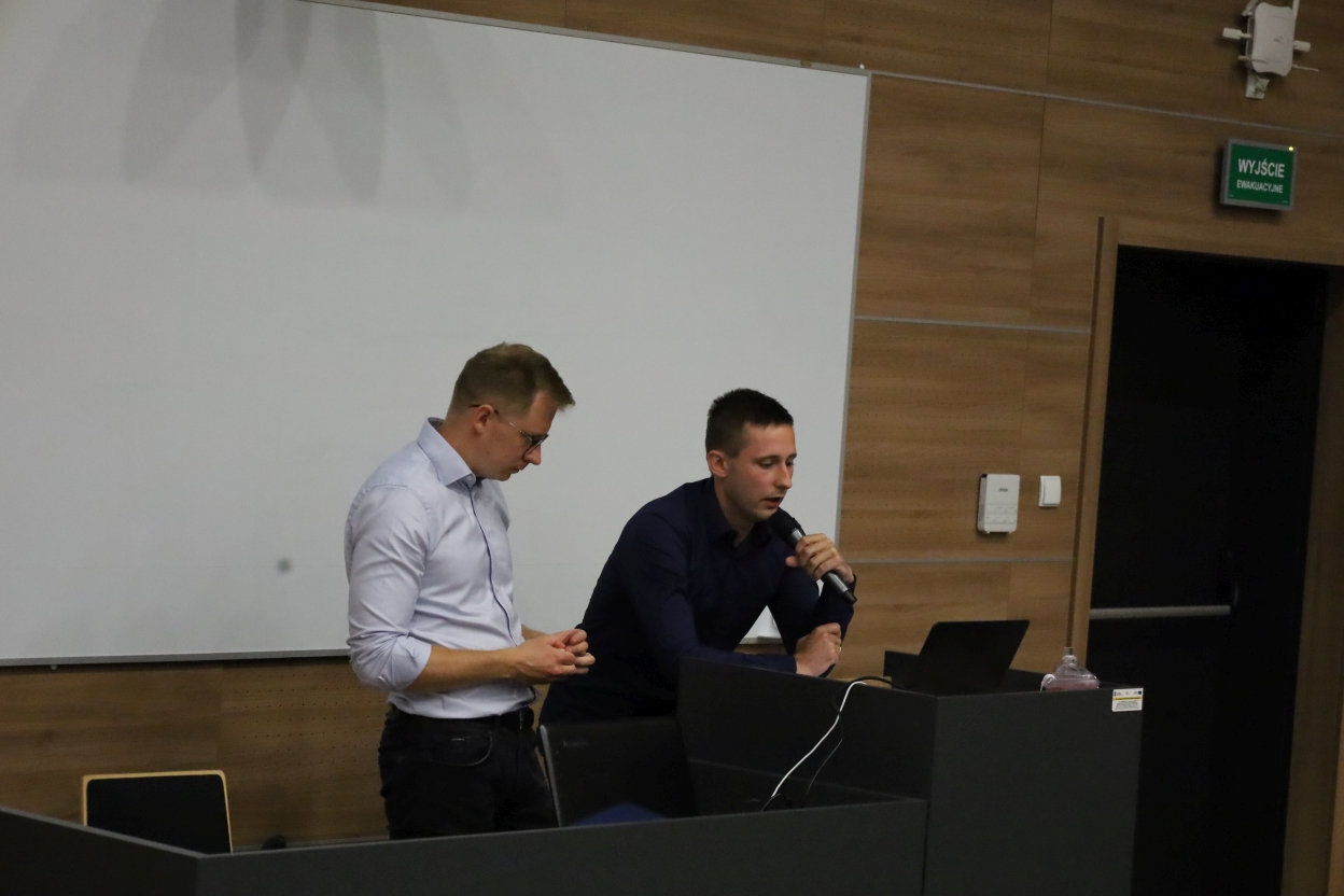 Obraz przedstawia wykład lub prezentację w pomieszczeniu. Dwie osoby stoją z przodu sali przy mównicy, na której znajduje się laptop. Za nimi znajduje się tablica na drewnianej ścianie.