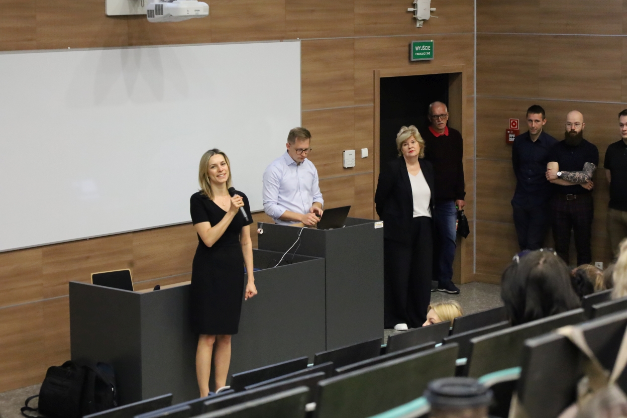 Na zdjęciu widać salę wykładową z widownią siedzącą w rzędach, widzianą od tyłu. Ściany i meble są z drewnianych paneli, a fotele czarne i tapicerowane. Z przodu znajdują się dwa ekrany z wyświetlonym slajdem oraz prelegent przy mównicy i druga osoba na stołku. Widać też tablicę i drzwi. Publiczność jest zaangażowana, niektórzy robią notatki lub korzystają z urządzeń elektronicznych.