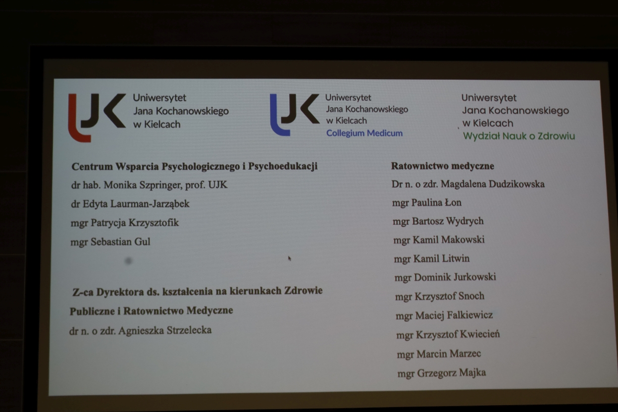 Obraz przedstawia slajd z projekcji zawierający informacje tekstowe z Uniwersytetu Jana Kochanowskiego w Kielcach. Slajd podzielony jest na trzy sekcje. Na górze znajdują się trzy logotypy i nazwy uczelni w różnych kolorach: czerwonym, niebieskim i zielonym. Poniżej, po lewej stronie, znajduje się sekcja „Centrum Wsparcia Psychologicznego i Psychoedukacji” z listą nazwisk i tytułów. W środku widnieje podtytuł dotyczący zastępcy dyrektora ds. kształcenia na kierunkach Zdrowie Publiczne i Ratownictwo Medyczne z podanym nazwiskiem. Po prawej stronie znajduje się sekcja „Ratownictwo medyczne” z kolejną listą osób.