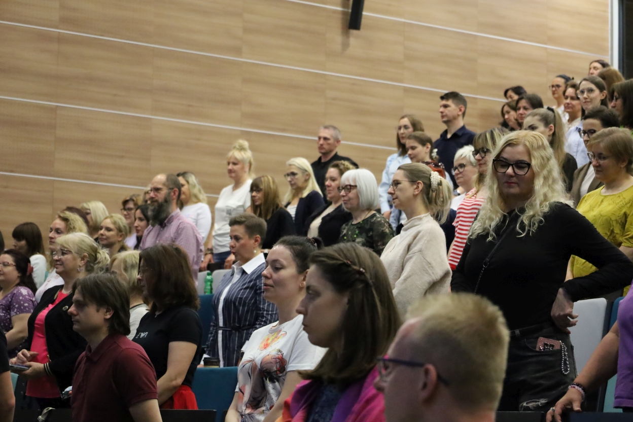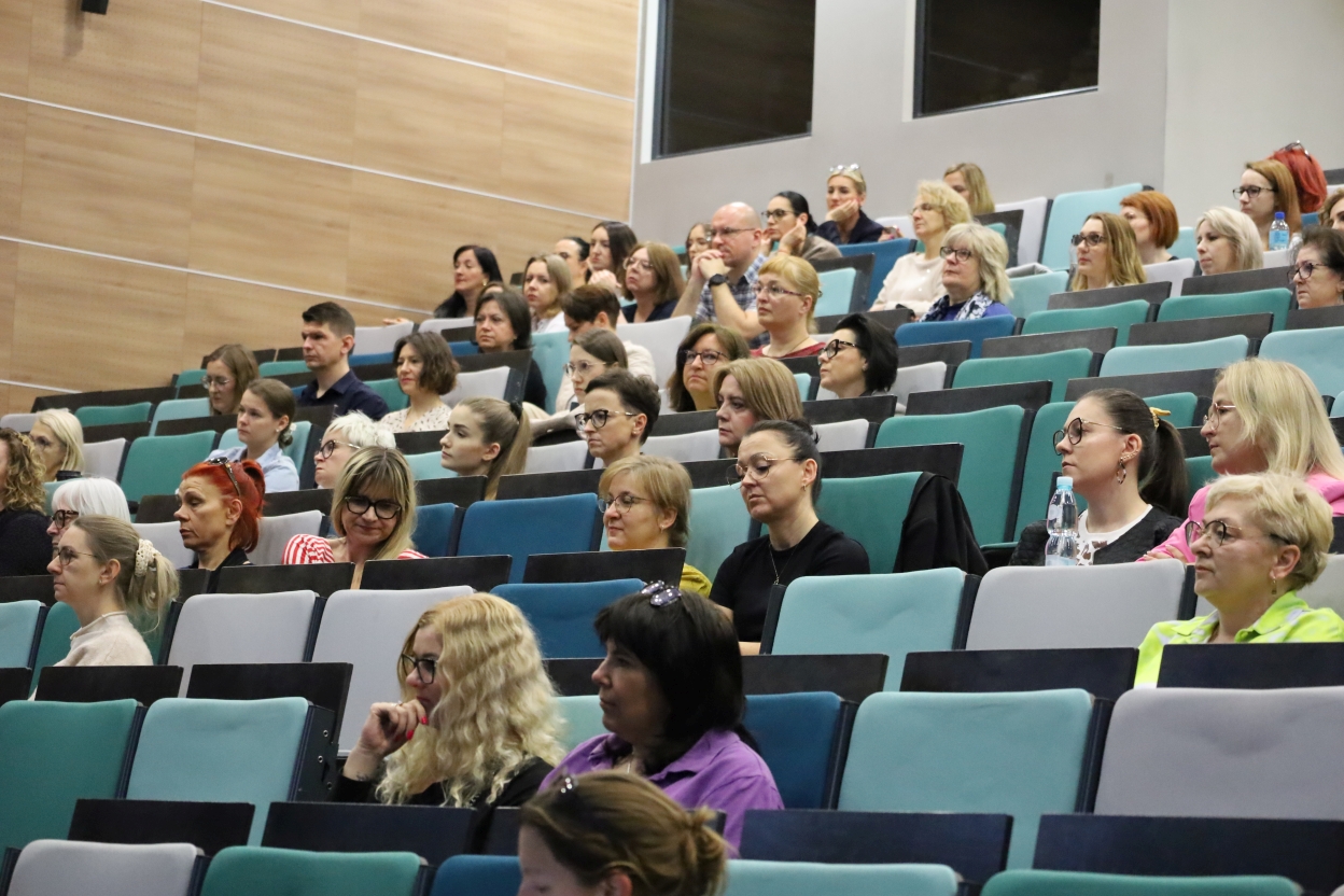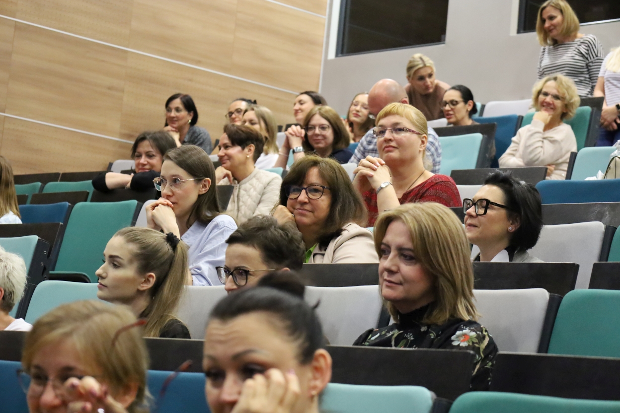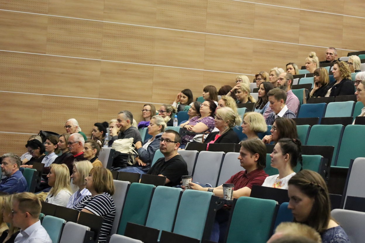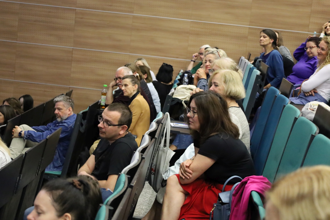 Na zdjęciu widać publiczność siedzącą w sali wykładowej z rzędami stopniowo wznoszących się miejsc. Fotele są obite materiałem w odcieniach szarości i turkusu. Uczestnicy, głównie dorośli, wyglądają na skupionych i zaangażowanych.