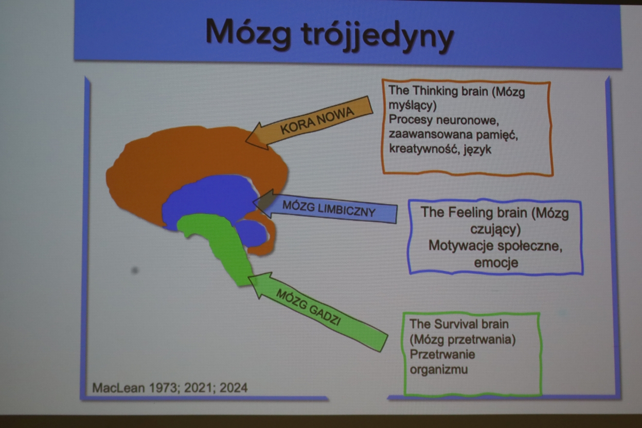 Obraz przedstawia edukacyjny diagram zatytułowany „Mózg trójjedyny”, ilustrujący koncepcję trójdzielnego mózgu. Pokazany jest mózg z boku, podzielony na trzy kolorowe części: pomarańczową („Kora Nowa”), niebieską („Mózg Limbiczny”) i zieloną („Mózg Gadzi”). Każda z nich ma strzałkę prowadzącą do opisu funkcji: „Kora Nowa” – „mózg myślący”, odpowiada za pamięć, kreatywność i język; „Mózg Limbiczny” – „mózg czujący”, związany z emocjami i motywacjami społecznymi; „Mózg Gadzi” – „mózg przetrwania”, odpowiada za podstawowe mechanizmy przetrwania. Na dole diagramu podano źródła: „MacLean 1973; 2021; 2024.”