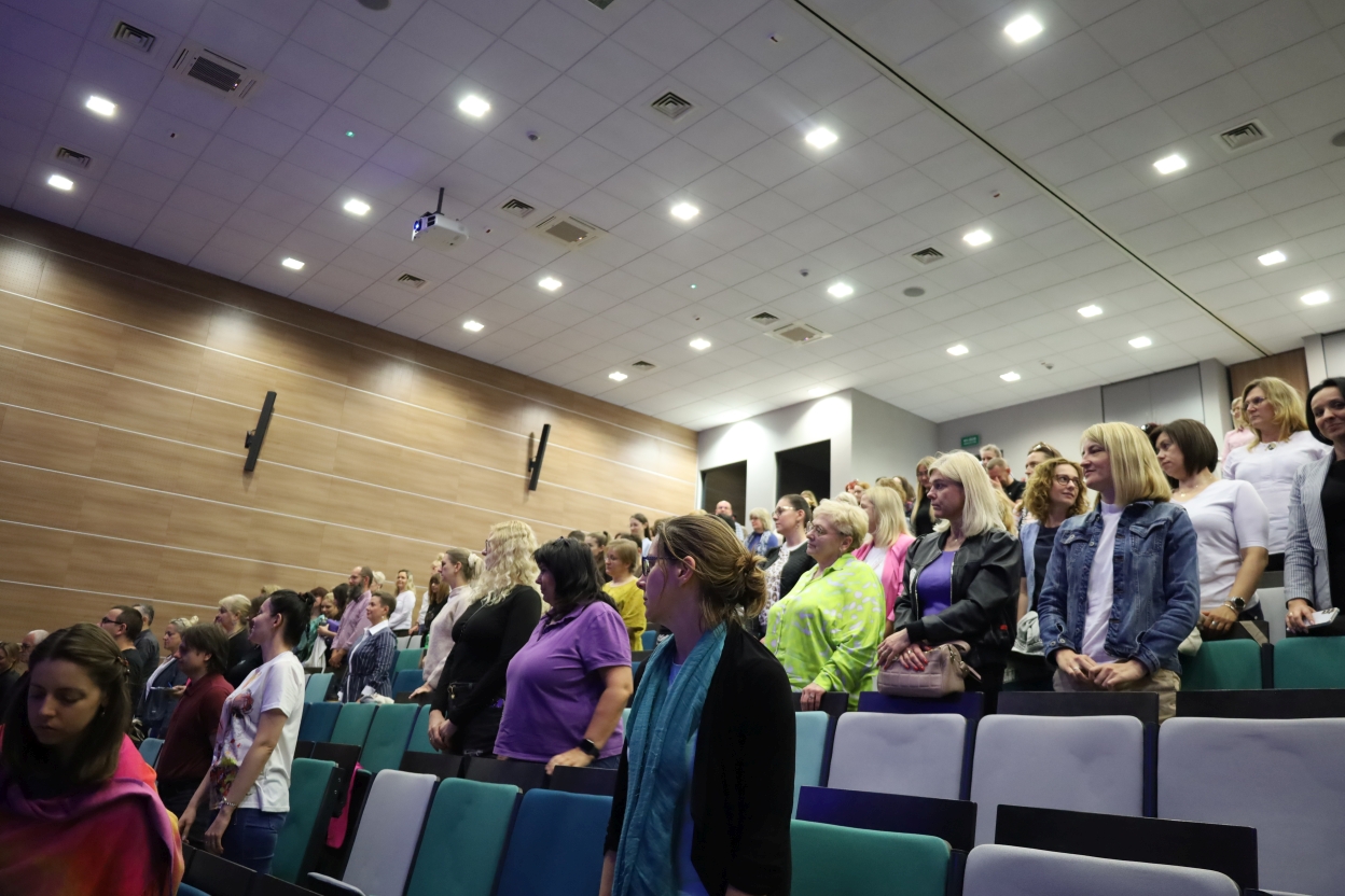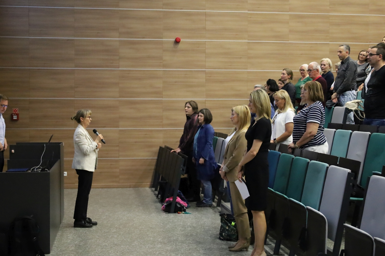 Obraz przedstawia audytorium, w którym grupa osób stoi. Po lewej stronie kobieta w jasnej marynarce i ciemnych spodniach mówi do mikrofonu, stojąc przy mównicy. Publiczność – kobiety i mężczyźni w różnym wieku – ustawiona jest w kilku rzędach schodkowo rozmieszczonych miejsc. Fotele mają tapicerkę w odcieniach zieleni i szarości.