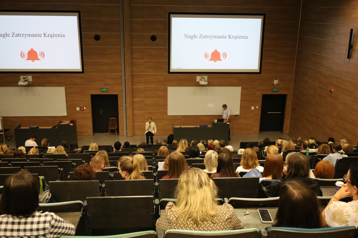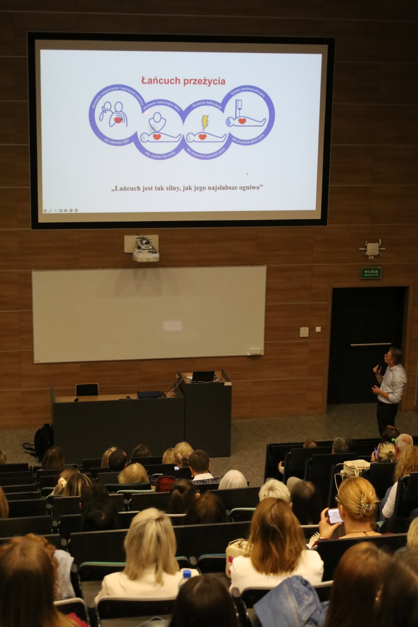 Na zdjęciu widać salę wykładową z publicznością oglądającą prezentację. Na dużym ekranie z przodu wyświetlony jest diagram zatytułowany „Łańcuch przeżycia” przedstawiający kolejne etapy reakcji w sytuacji awaryjnej. Po prawej stoi prelegent przemawiający do słuchaczy. Atmosfera jest formalna i edukacyjna.