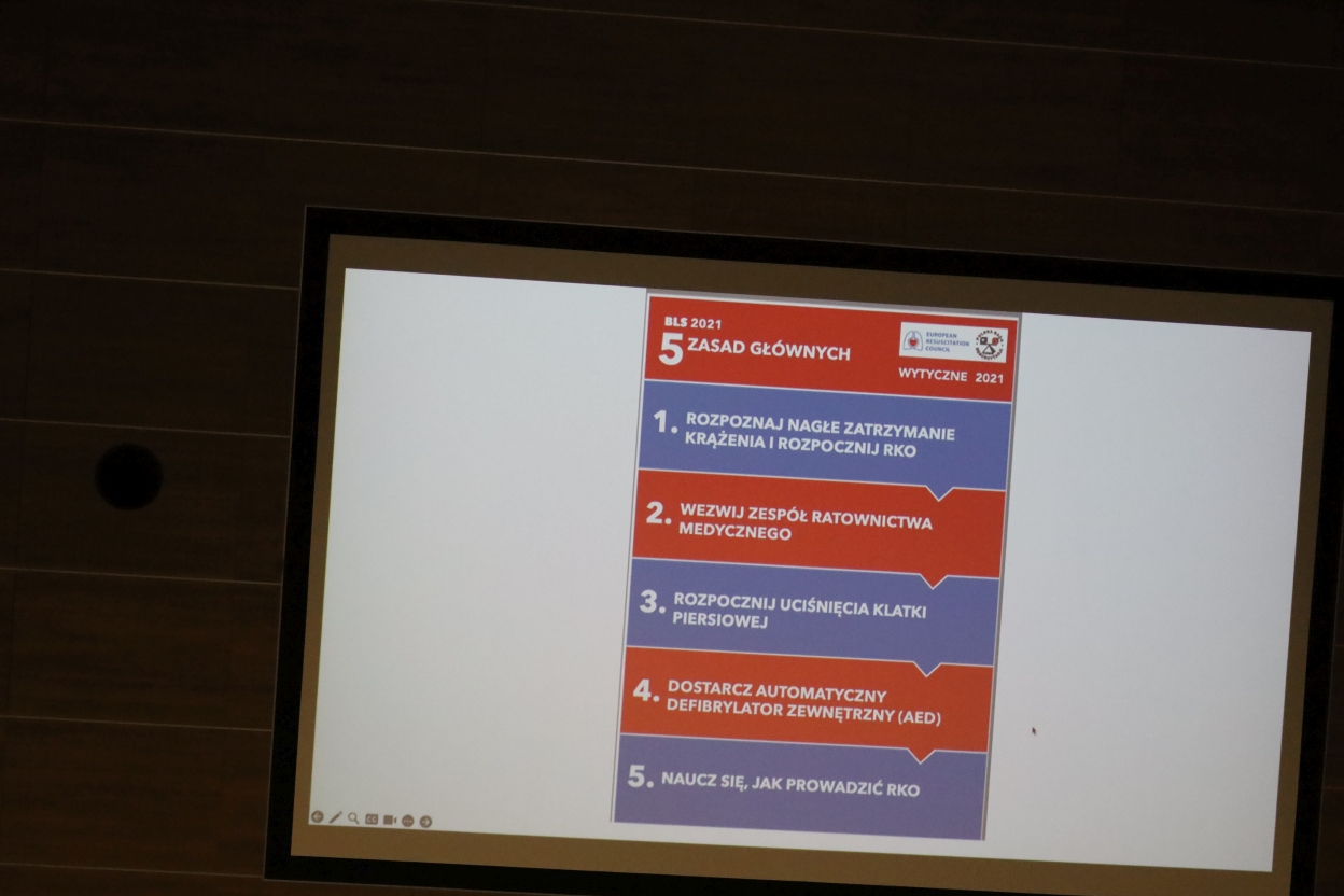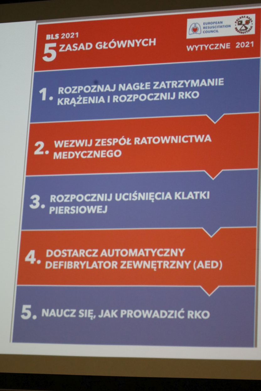 Na zdjęciu widać slajd z prezentacją przedstawiający plakat zatytułowany „5 ZASAD GŁÓWNYCH” z wytycznych BLS 2021. Plakat zawiera pięć punktów ułożonych pionowo na przemian na niebieskim i czerwonym tle. U góry znajdują się logotypy Europejskiej Rady Resuscytacji i innych organizacji.