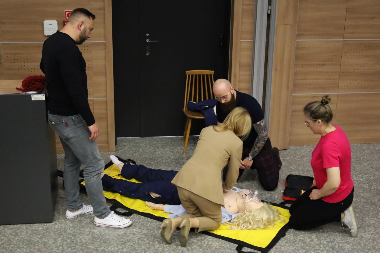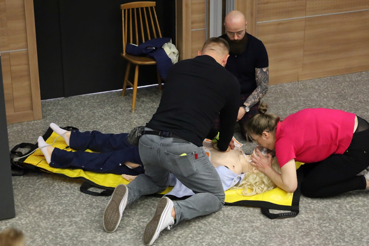 Na zdjęciu trzy osoby ćwiczą pierwszą pomoc na manekinie z blond peruką, leżącym na żółtym noszach na szarej, marmurkowej podłodze. Obok manekina stoi otwarta czerwona apteczka. W tle widać czarne drzwi z zielonym znakiem wyjścia i stos krzeseł przy drewnianej ścianie.