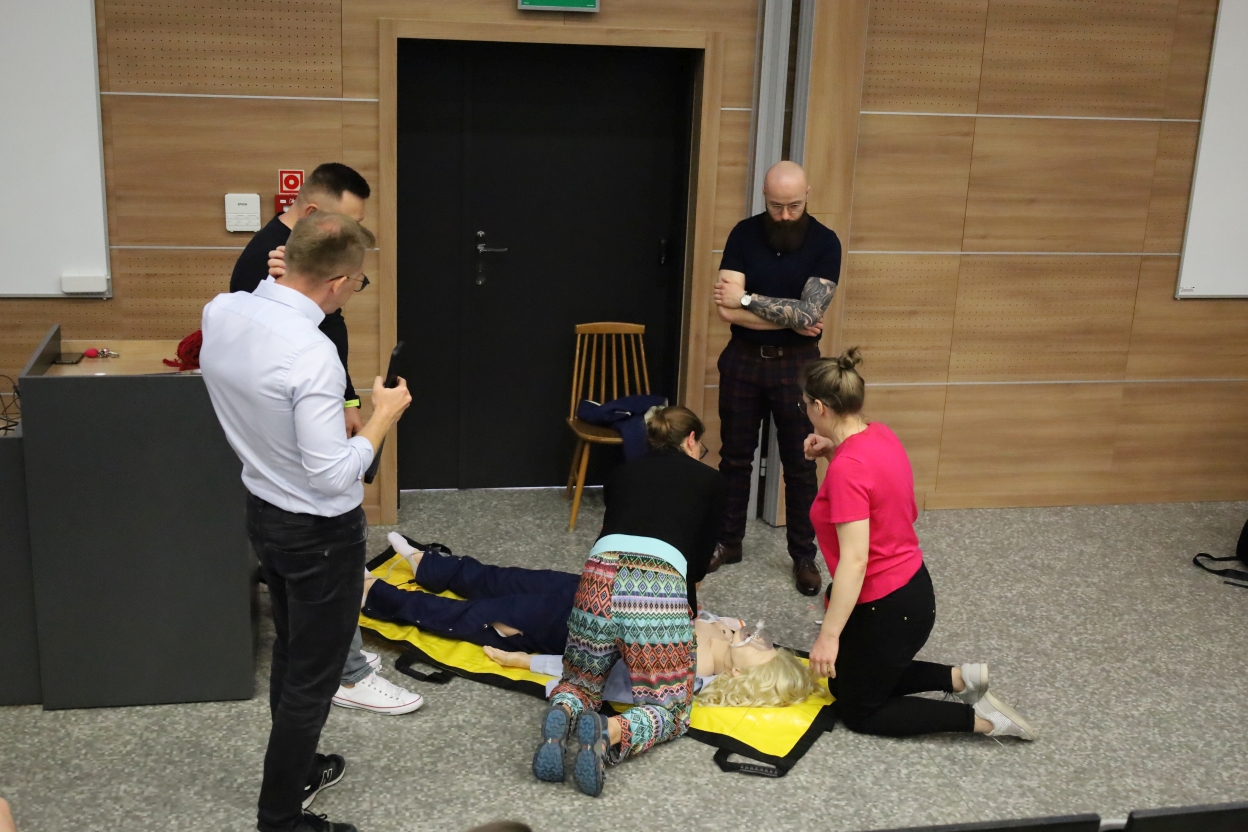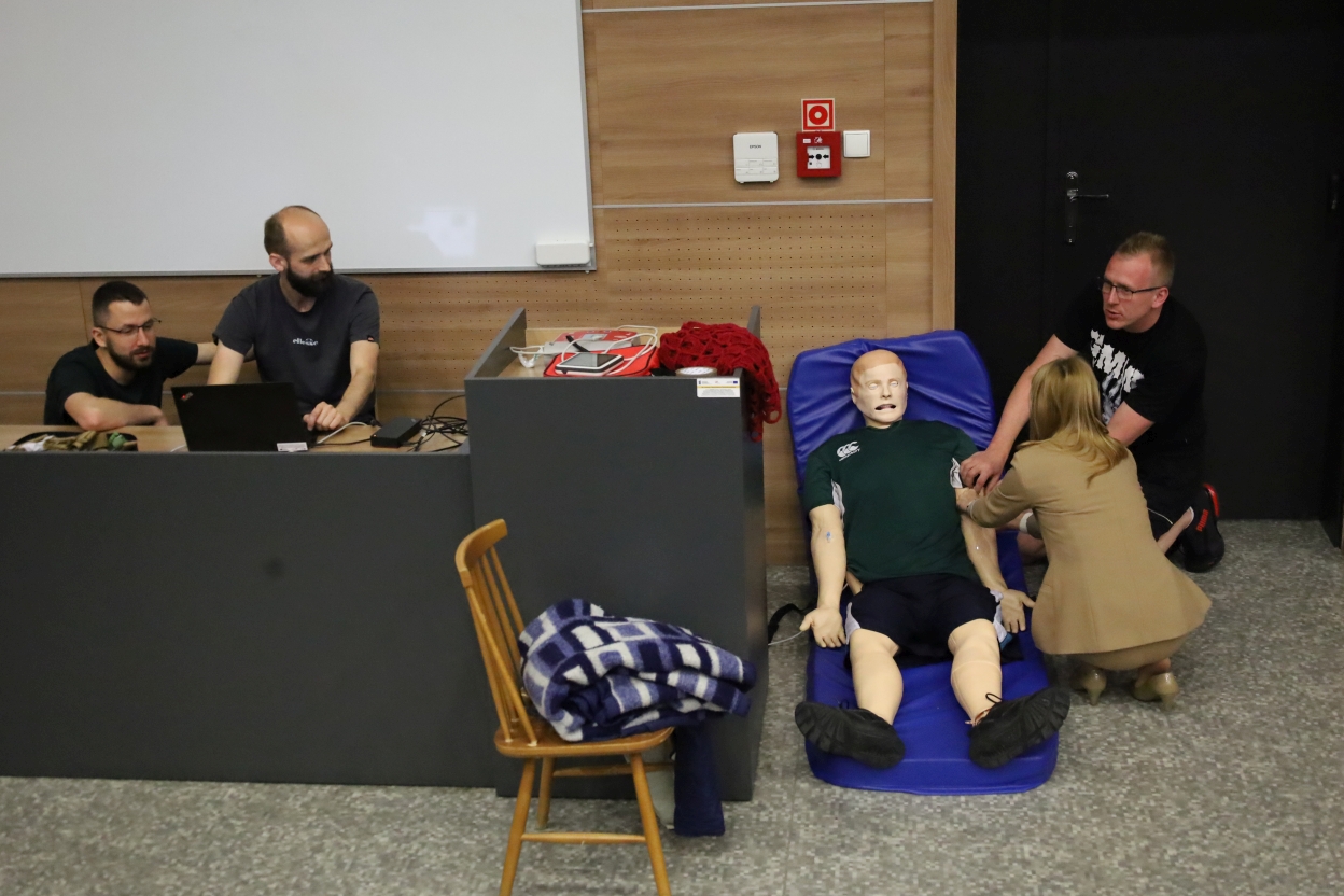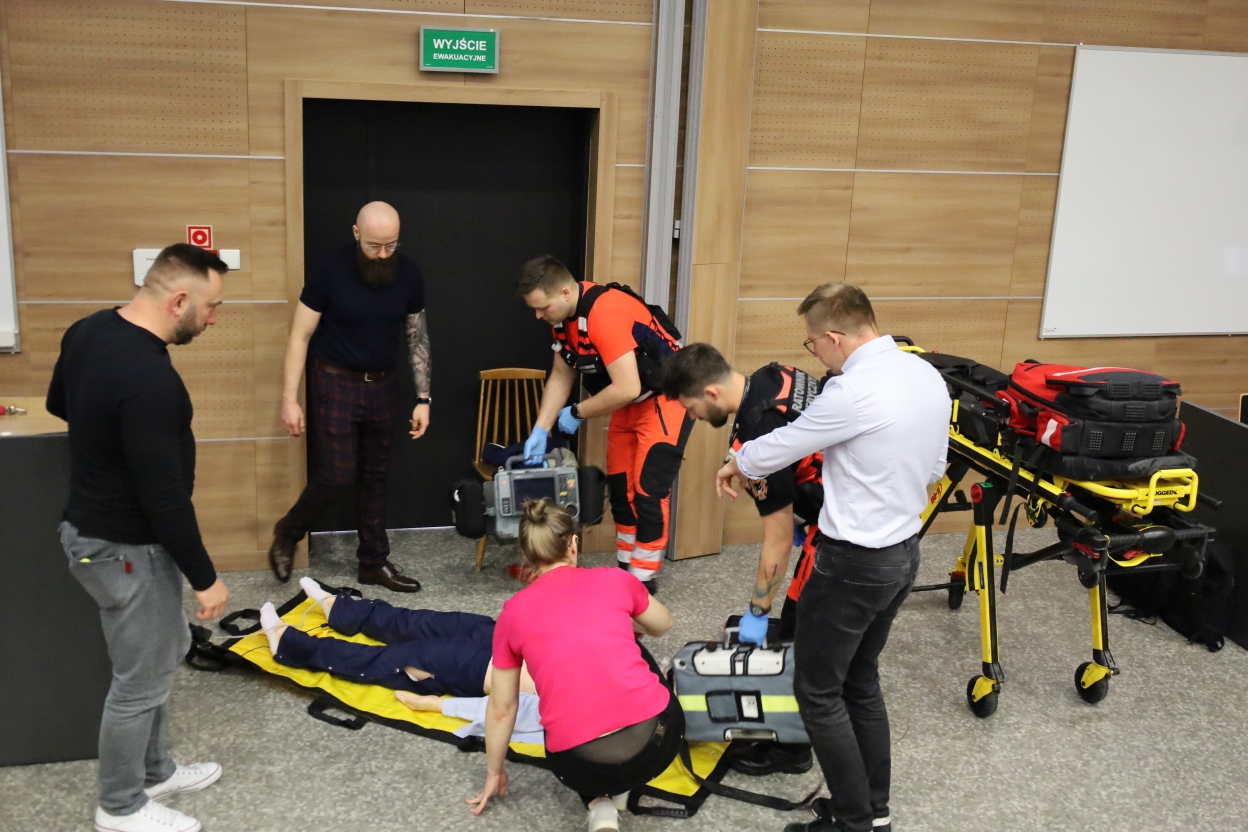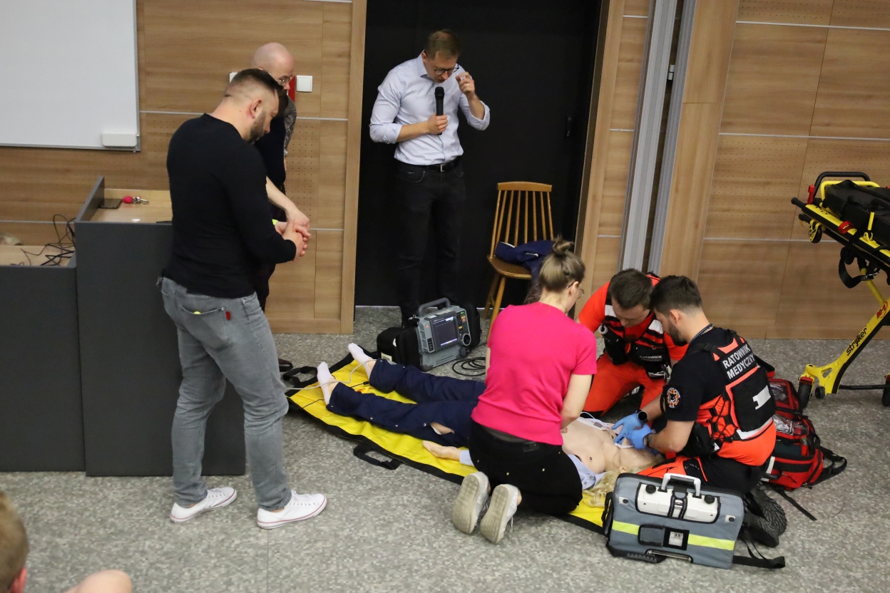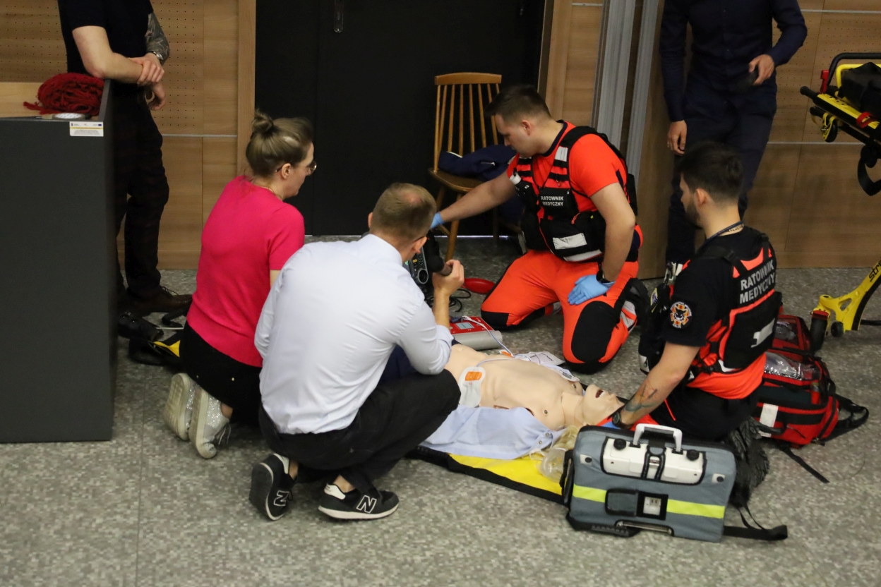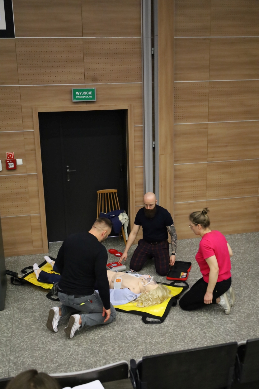 Na zdjęciu grupa osób uczestniczy w ćwiczeniach resuscytacji. Trzy osoby klęczą przy manekinie, dwie w mundurach ratunkowych, jedna w różowej koszuli. Obok leży sprzęt medyczny, m.in. defibrylator. W tle dwie osoby obserwują, jedna z mikrofonem, przy drewnianej ścianie. Widać też nosze i podium, sugerujące salę wykładową.