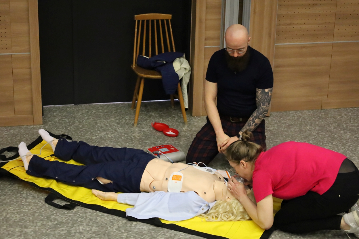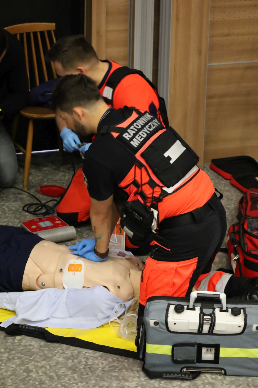 Na zdjęciu dwie osoby w pomarańczowo-czarnych uniformach ćwiczą na manekinie leżącym na żółtej macie. Jedna z nich zakłada elektrody defibrylatora. Widać też sprzęt medyczny oraz drewnianą ścianę i fragment krzesła w tle.