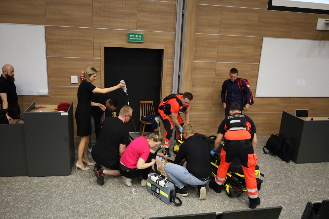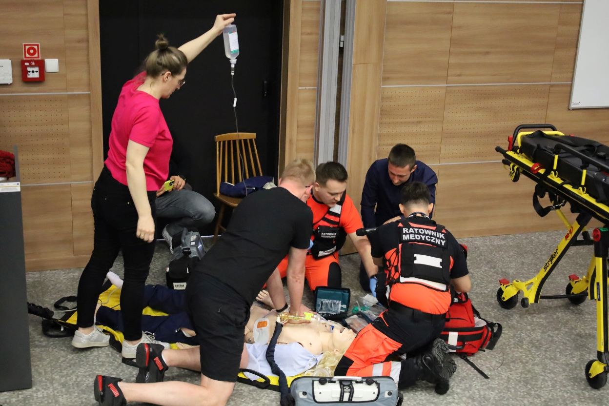 Na zdjęciu sześć osób uczestniczy w ćwiczeniach medycznych przy manekinie leżącym na żółtej macie. Dwie osoby klęczą obok – jedna w różowej koszuli, druga w czarno-pomarańczowym uniformie. Kobieta trzyma kroplówkę, a pozostali obserwują i korzystają z urządzeń. Obok stoi nosze na kółkach.