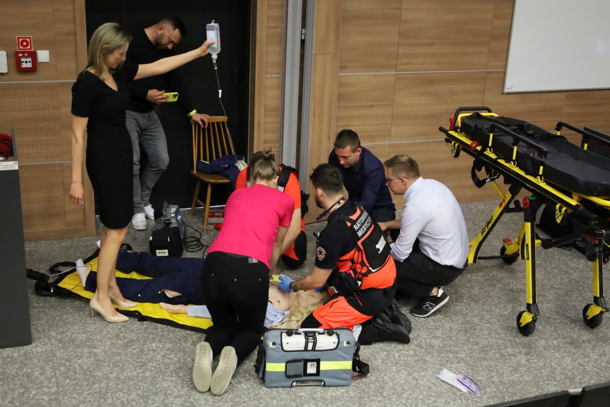 Na zdjęciu grupa osób uczestniczy w ćwiczeniach pierwszej pomocy w pomieszczeniu z drewnianymi panelami. Dwóch ratowników w pomarańczowych uniformach, kobieta w czarnej sukience trzyma kroplówkę, a mężczyzna obserwuje. Na podłodze leży manekin i sprzęt medyczny.