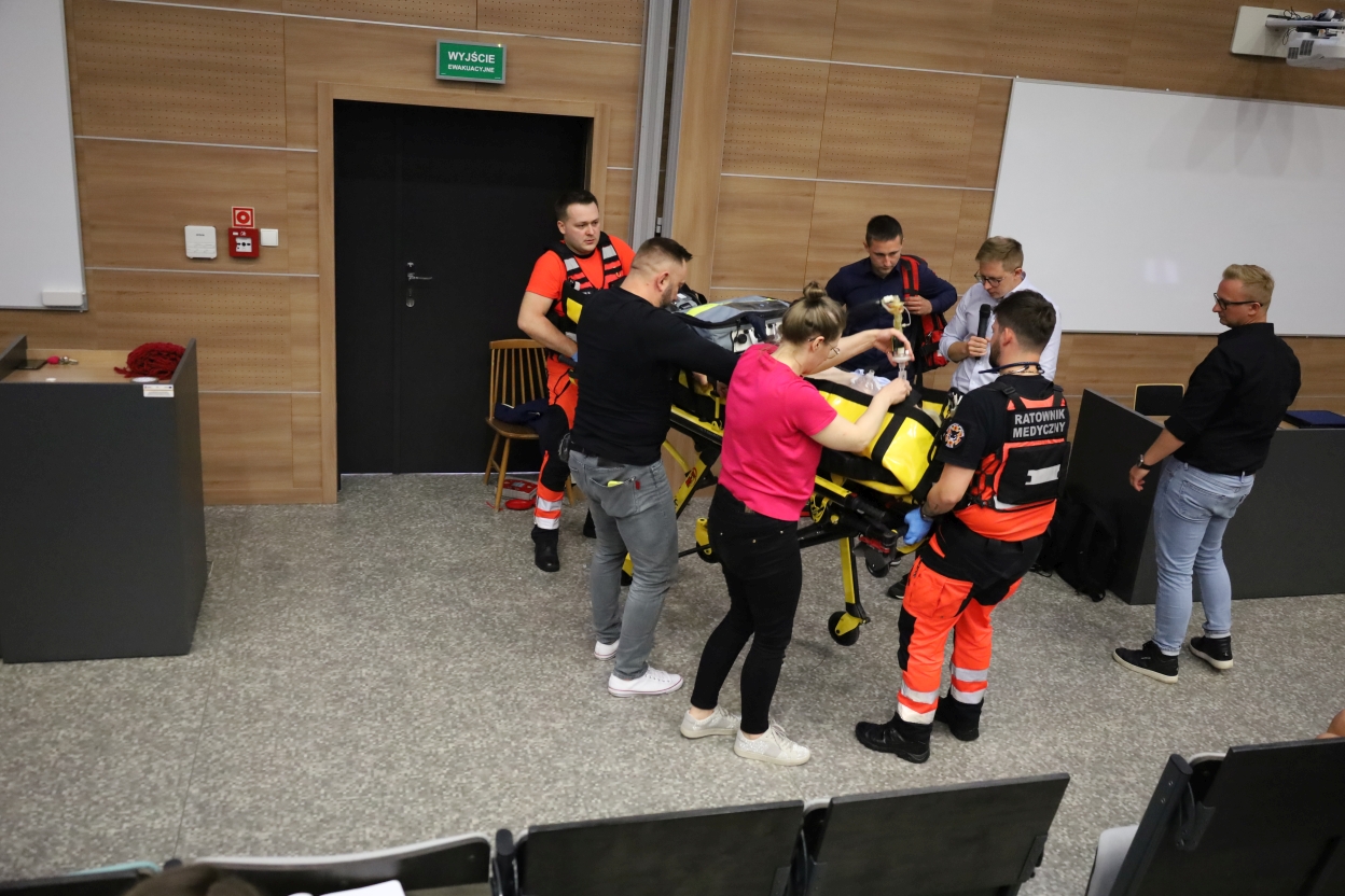 Na zdjęciu sześć osób, w tym kilka w uniformach ratowników, bierze udział w ćwiczeniach przy żółto-czarnych noszach ustawionych centralnie. Widać sprzęt medyczny, a scenerię tworzą drewniane panele ścian, ciemne drzwi z krzesłem obok, duża biała tablica oraz mównica po lewej stronie.
