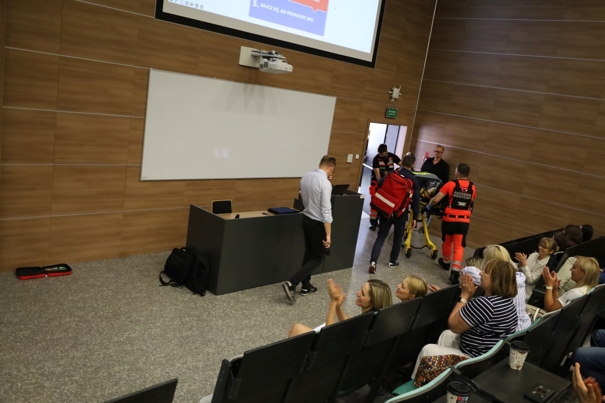 Na zdjęciu widać salę wykładową, w której odbywa się prezentacja. Na pierwszym planie osoby siedzące w fotelach klaszczą, a mężczyzna w białej koszuli z mikrofonem kieruje się w stronę przodu sali. Na podwyższeniu znajduje się czarna mównica z urządzeniami elektronicznymi, a za nią tablica na tle drewnianych paneli. W tle dwóch ratowników w pomarańczowo-czarnych uniformach wprowadza nosze z osobą przez drzwi. Nad sceną wyświetlany jest slajd z częściowo widocznym tekstem.