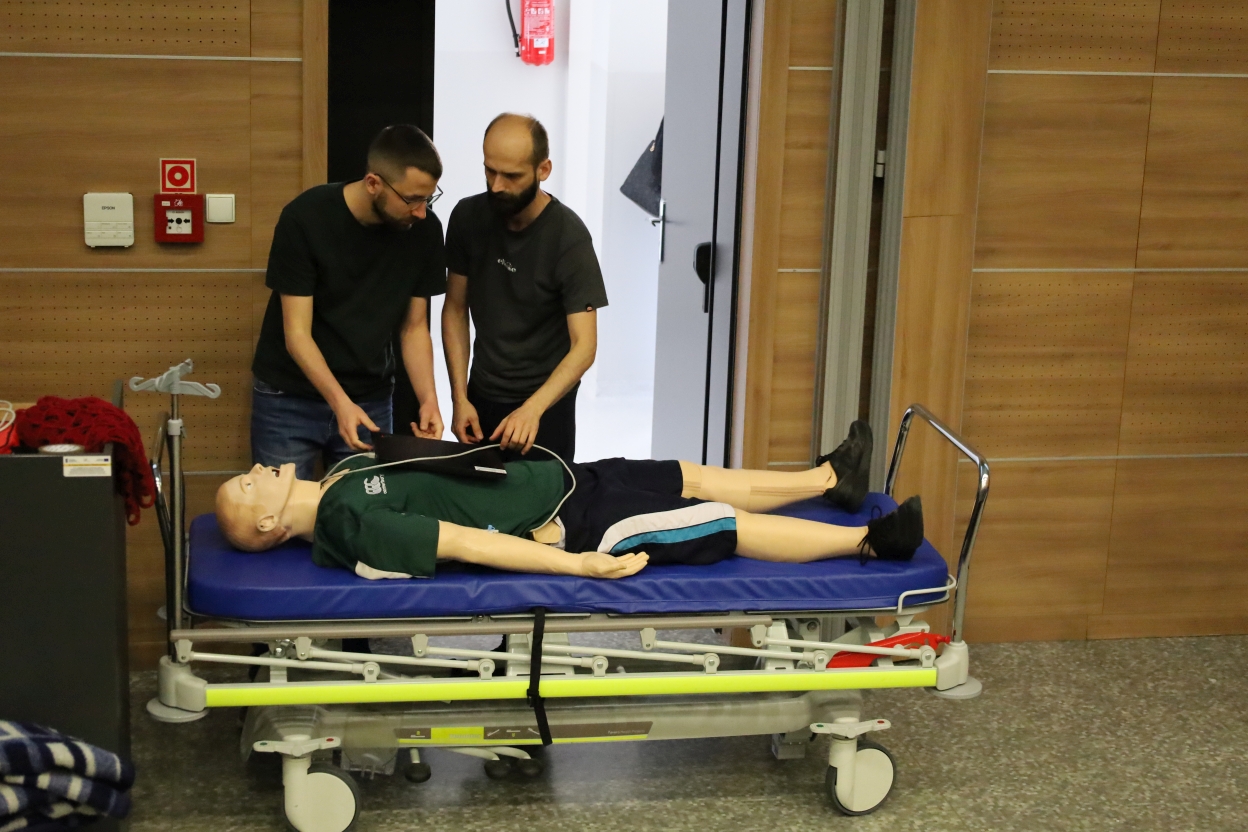 Na zdjęciu znajduje się realistyczny manekin treningowy ułożony na niebieskiej macie piankowej w pozycji półsiedzącej z wyprostowanymi nogami. Ubrany jest w zieloną koszulkę i granatowe spodenki. Po lewej stronie stoi szary stół z czerwonym materiałem i przewodami, a na pobliskim drewnianym krześle leży kraciasty koc. W tle dwie osoby przemieszczają białe nosze przez drzwi.
