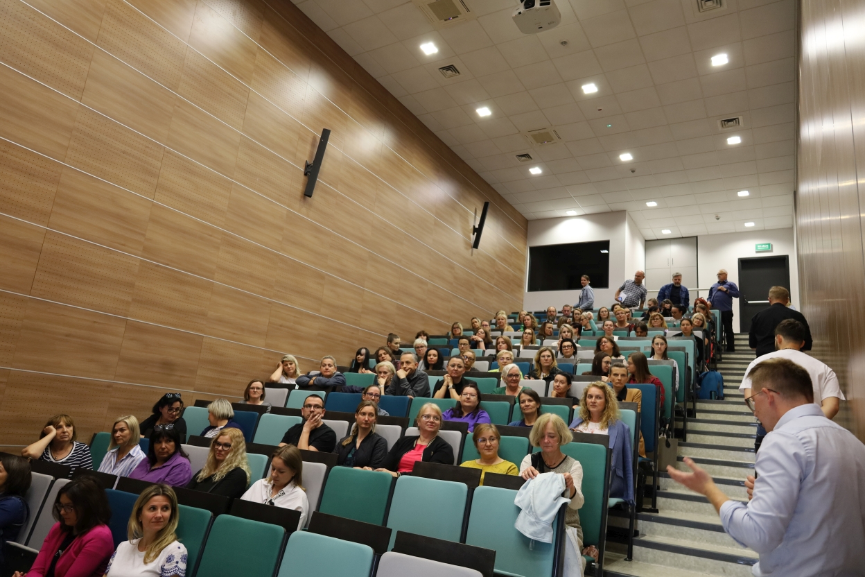 Na zdjęciu grupa osób siedzi na widowni w sali wykładowej z drewnianymi ścianami i mieszanymi kolorami krzeseł. Uczestnicy są zaangażowani – niektórzy robią notatki, inni słuchają uważnie.