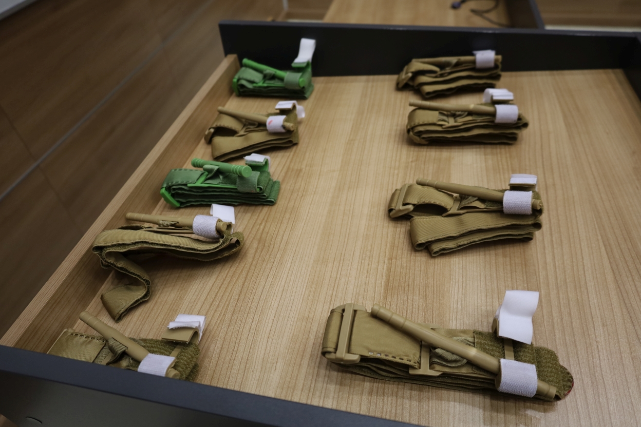 Na zdjęciu widoczna jest szuflada z dziewięcioma taktycznymi opaskami uciskowymi ułożonymi w rzędach. Sześć opasek jest w kolorze khaki, a trzy w zielonym. Każda opaska wyposażona jest w pręt oraz biały pasek na rzep. Szuflada ma ciemne krawędzie, które kontrastują z jasnym, drewnianym wnętrzem.