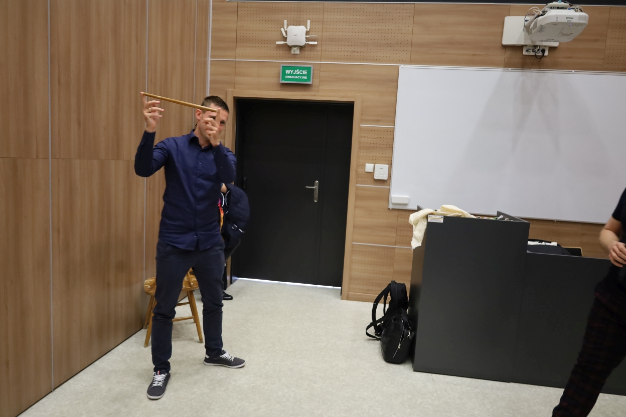 Na zdjęciu widać nowoczesne wnętrze sali lekcyjnej z drewnianymi panelami na ścianach. Osoba w niebieskiej koszuli i ciemnych spodniach stoi obok drewnianego stołka, trzymając w ręce miarkę. Po prawej na ścianie znajduje się duża tablica, nad którą wisi projektor. Obok tablicy stoi szara szafka, na której leżą różne przedmioty i torby.