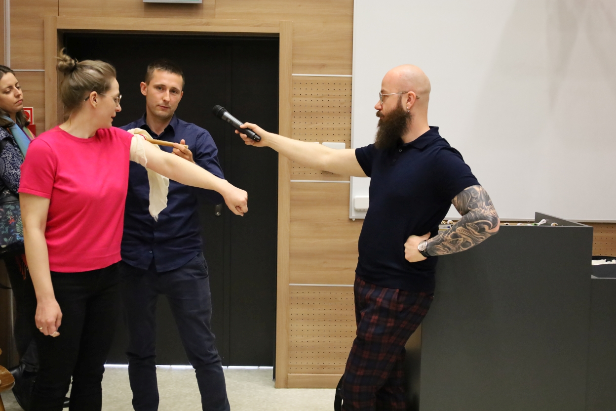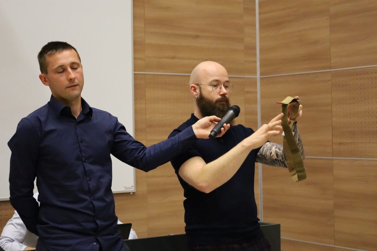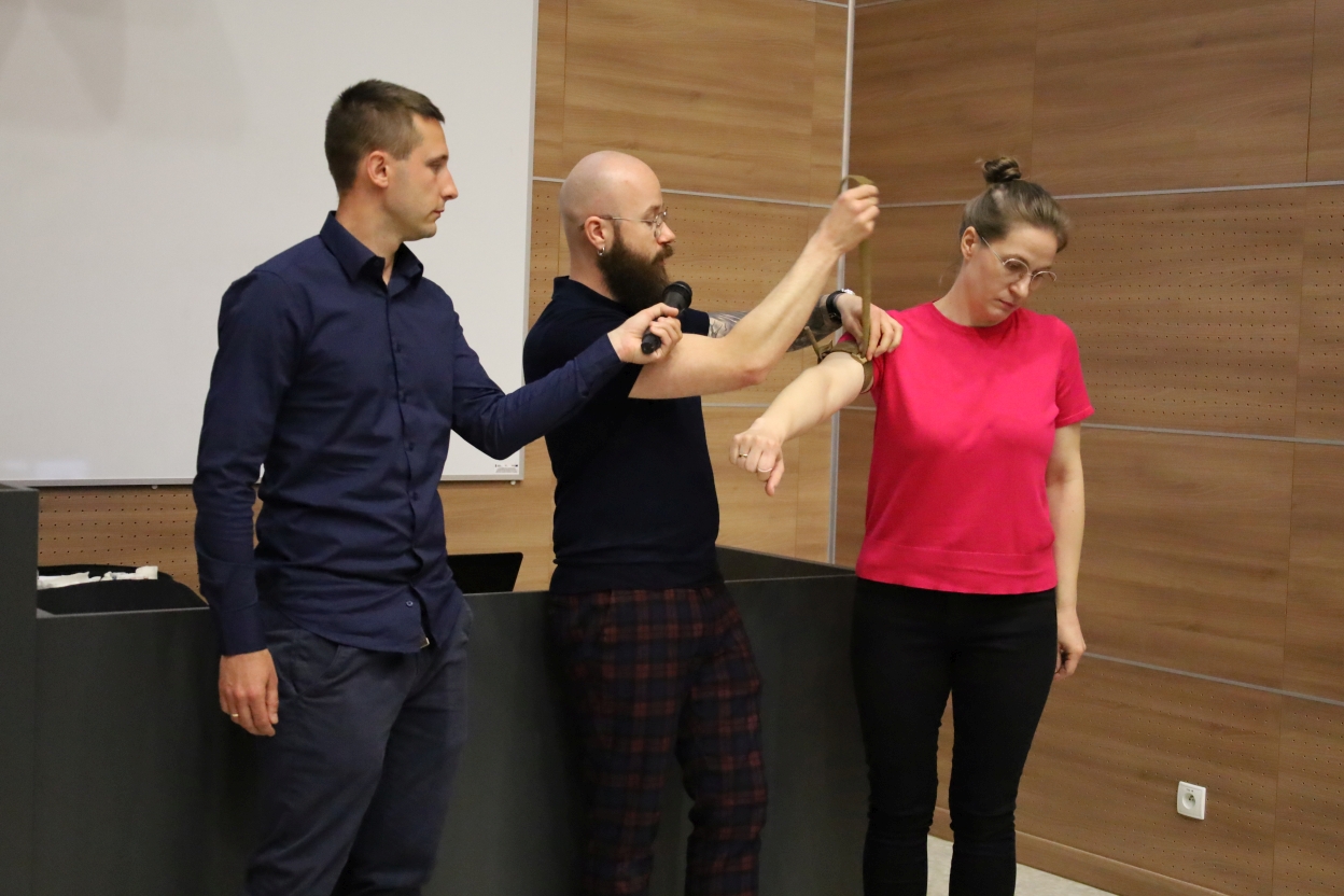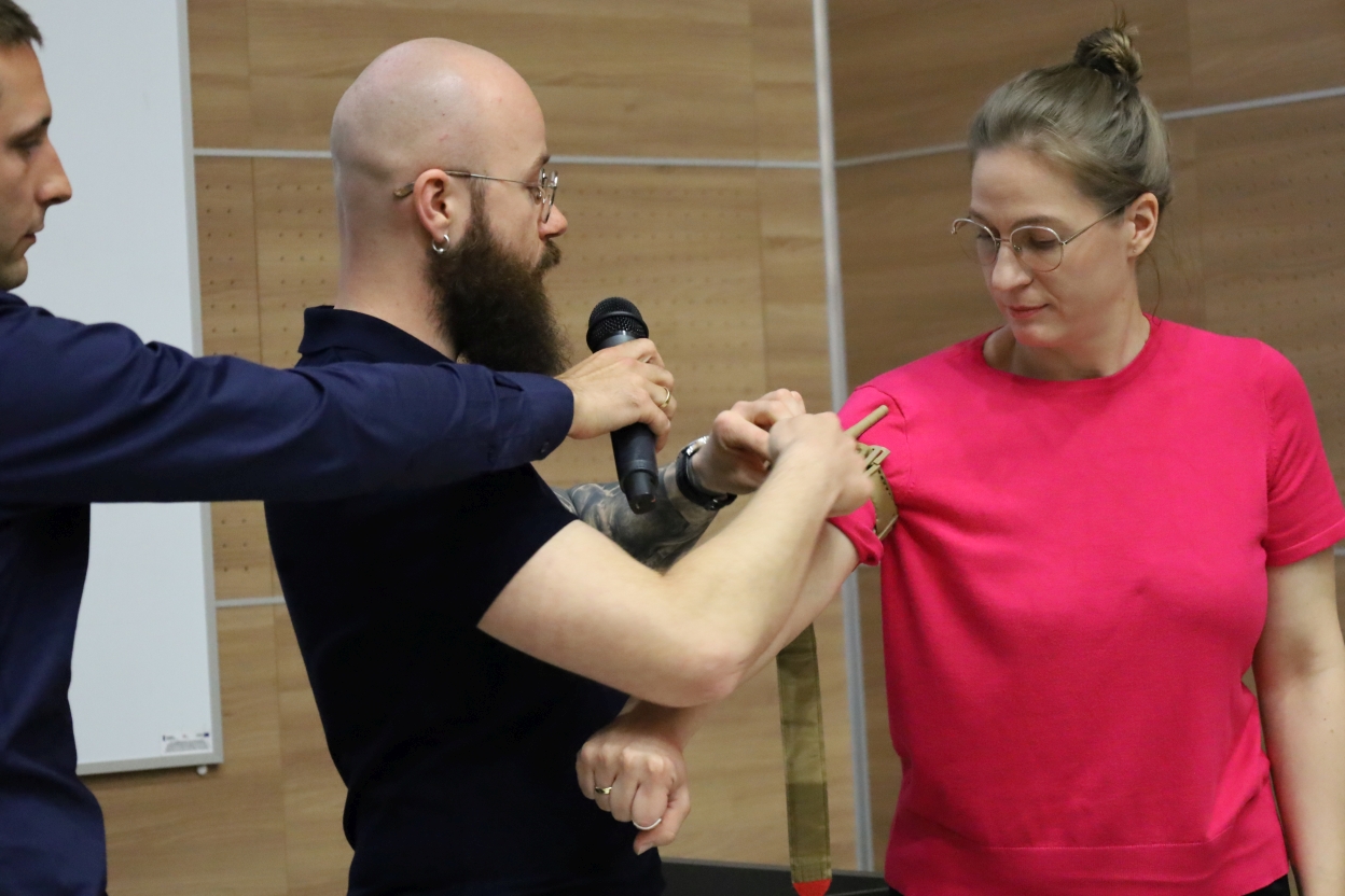 Na zdjęciu trzy osoby stoją w pomieszczeniu z drewnianymi ścianami. Osoba po lewej trzyma mikrofon w stronę środkowej osoby, która demonstruje technikę zakładania opaski na ramię osoby po prawej, mającej wyciągniętą rękę.