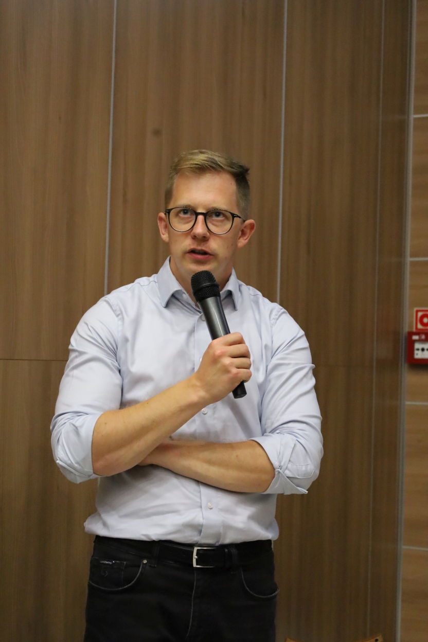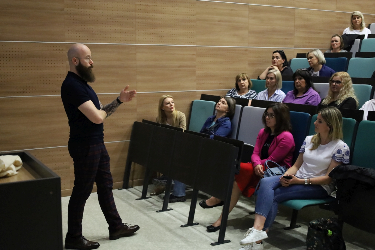 Na zdjęciu nowoczesna aula wykładowa z widownią siedzącą w podwyższonych rzędach. Z lewej strony stoi osoba z łysą głową, ubrana w ciemną koszulę i kraciaste spodnie, gestykulując podczas prezentacji. Publiczność, głównie kobiety, siedzi w tapicerowanych fotelach w odcieniach zieleni i szarości.