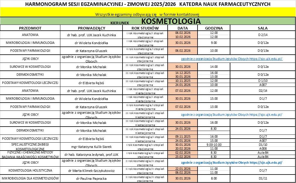 Harmonogram sesji egzaminacyjnej zimowej 2025/2026 – Kierunek Kosmetologia