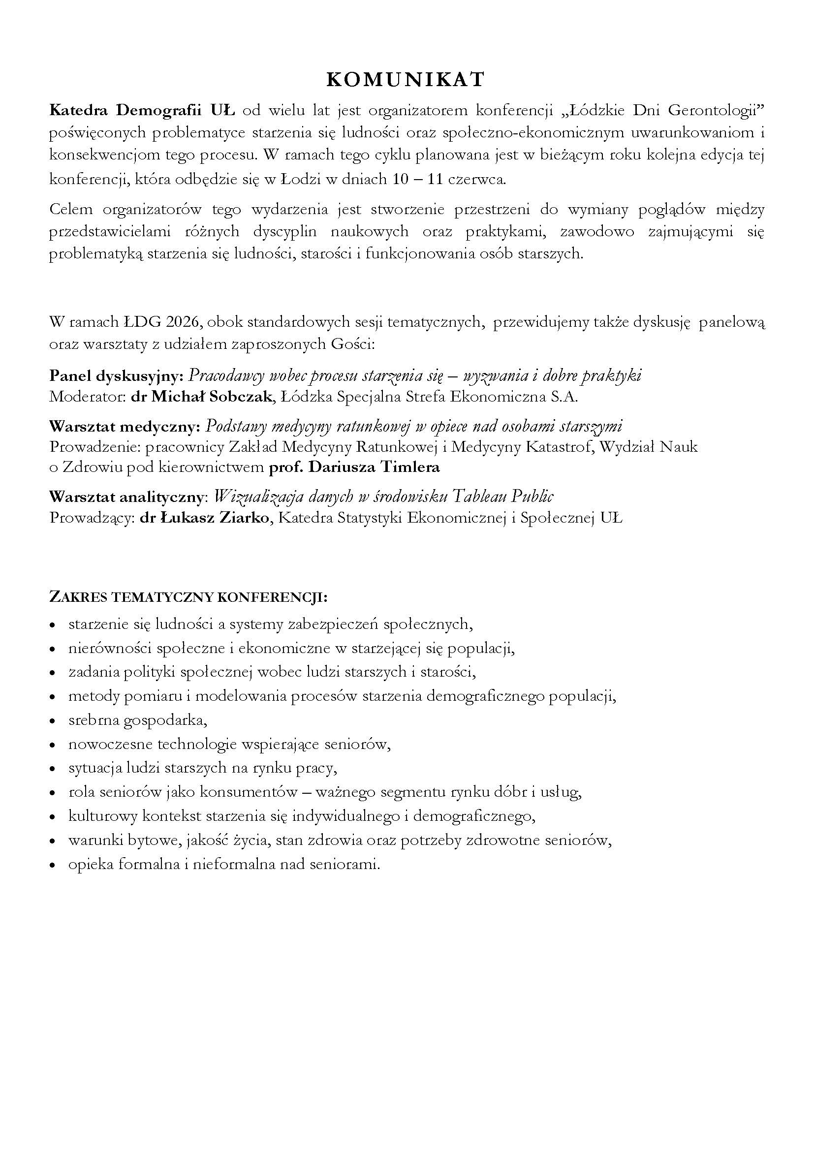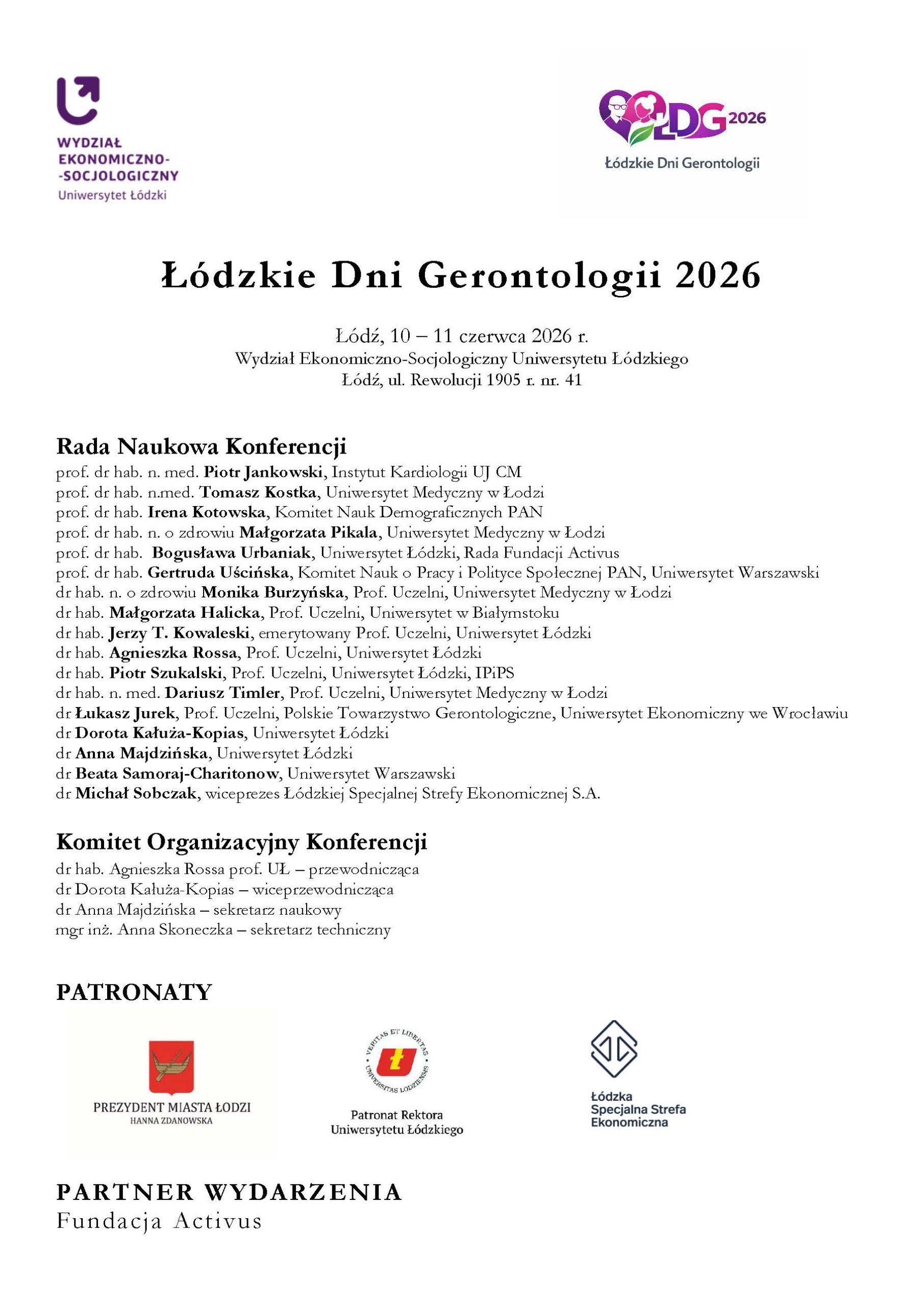 mamy przyjemność poinformować, że w dniach 10–11 czerwca 2026 r. w Łodzi odbędzie się kolejna edycja konferencji naukowej z cyklu Łódzkie Dni Gerontologii, organizowana przez Katedrę Demografii UŁ. Wydarzenie to, poświęcone wieloaspektowej problematyce starości, stanowi doskonałą okazję do dyskusji oraz prezentacji wyników badań.