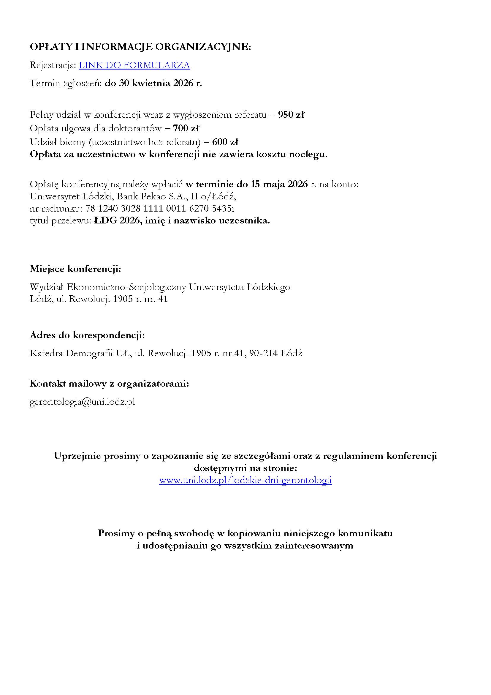 W załączniku przesyłamy ogólny komunikat dotyczący konferencji. Szczegółowe informacje, w tym regulamin uczestnictwa oraz formularz zgłoszeniowy, zostały zamieszczone na stronie internetowej wydarzenia: www.uni.lodz.pl/lodzkie-dni-gerontologii Uprzejmie zachęcamy do zapoznania się z nimi.
