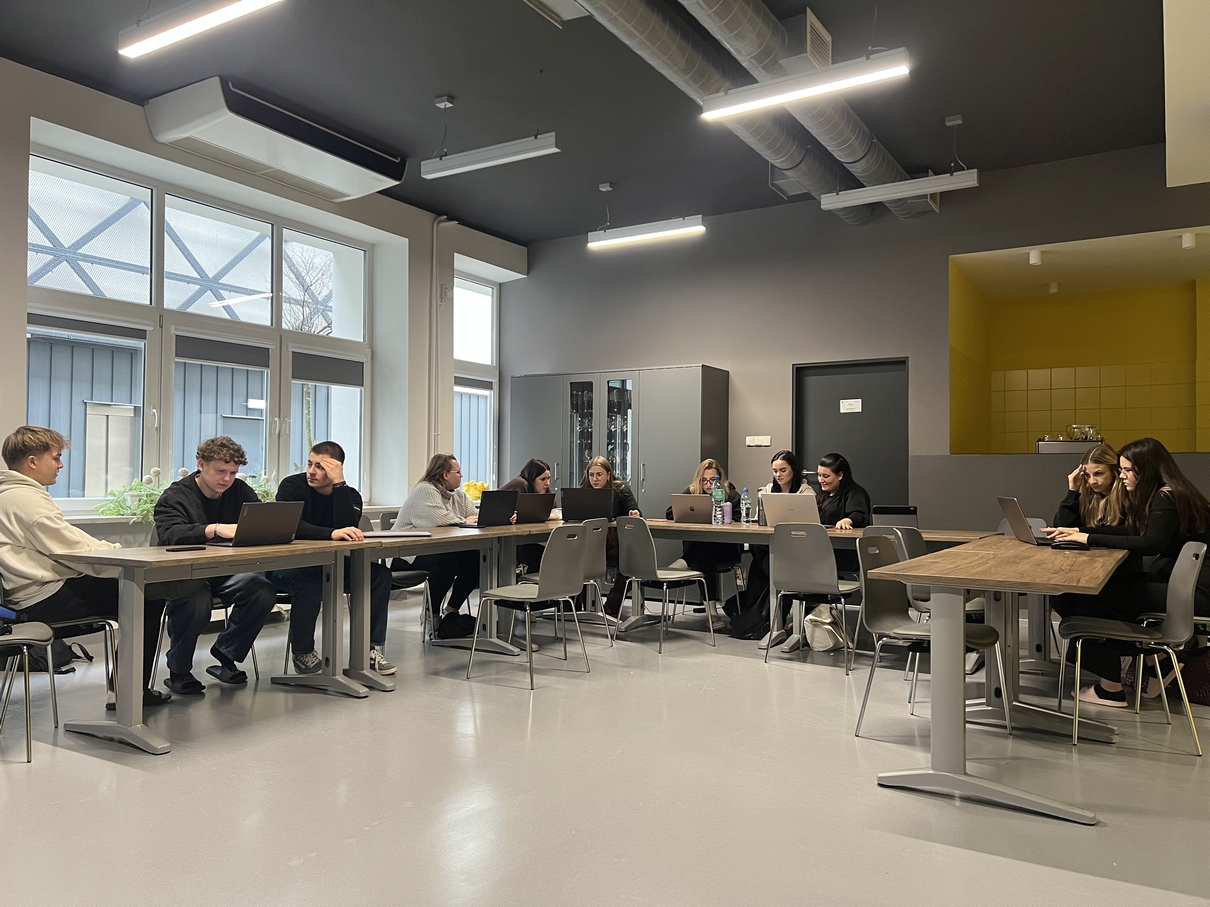 Obraz przedstawia salę dydaktyczną z kilkoma stołami, przy których używane są laptopy. Pomieszczenie jest dobrze oświetlone dzięki dużym oknom po jednej stronie. Wnętrze ma nowoczesny wygląd – jasna podłoga kontrastuje z ciemnym sufitem z widoczną instalacją oraz liniowym oświetleniem. Ściany utrzymane są w odcieniach szarości i żółci, a atmosfera sprzyja pracy i współpracy.