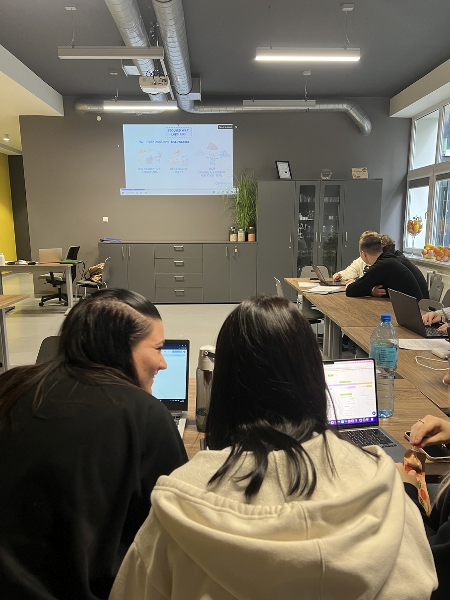 Podczas zajęć wykorzystano platformę edukacyjną Osmosis wydawnictwa Elsevier, do której studenci mają dostęp dzięki licencji wykupionej przez uczelnię. Platforma ta stanowi nowoczesne środowisko nauki oparte na aktualnej wiedzy medycznej, oferując bogaty zbiór multimedialnych materiałów dydaktycznych oraz interaktywne studia przypadków klinicznych. Praca z zasobami Osmosis umożliwiła studentom pogłębianie wiedzy z zakresu dietetyki klinicznej oraz rozwijanie umiejętności analizy problemów zdrowotnych pacjentów. Istotnym elementem zajęć było również wykorzystanie specjalistycznej terminologii anglojęzycznej, co pozwoliło studentom doskonalić kompetencje językowe niezbędne do korzystania z międzynarodowej literatury naukowej i aktualnych wytycznych medycznych.