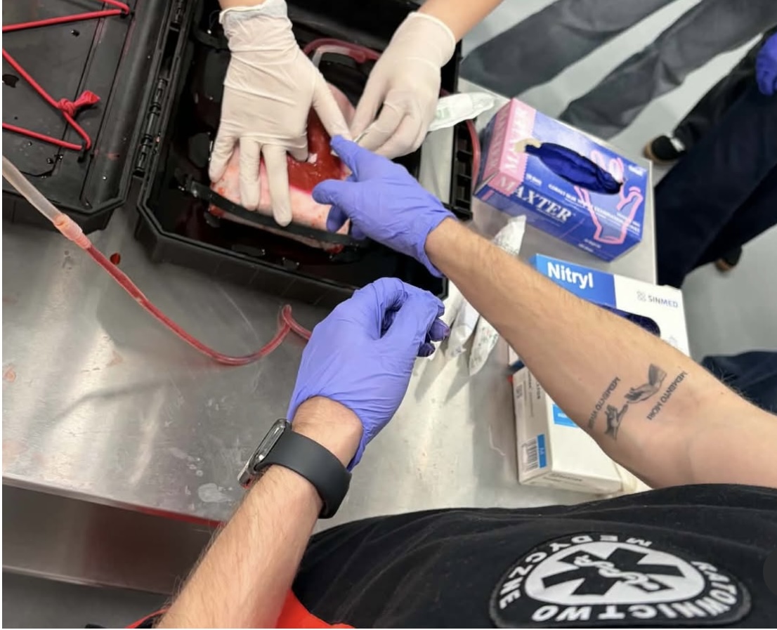 Uczestnicy biorą udział w szkoleniu medycznym, wykonując ćwiczenia na materiale symulującym tkanki. Na stole znajdują się zestawy ratunkowe z opatrunkami i sprzętem, a osoby prowadzące pracują w rękawicach. W tle widoczne jest lustro odbijające pozostałych uczestników oraz wyposażenie sali, co podkreśla praktyczny charakter zajęć.