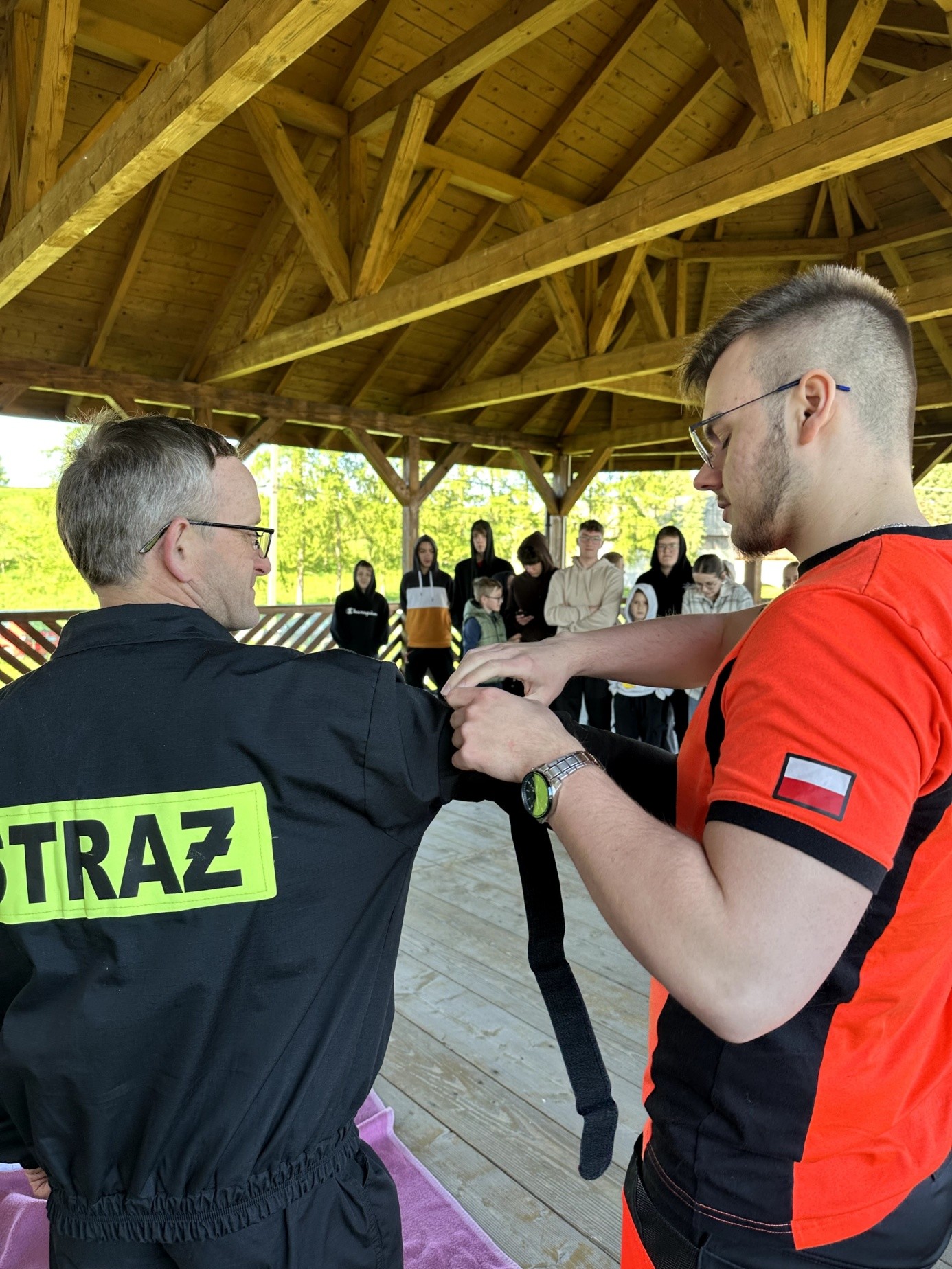 Obraz przedstawia dwie osoby stojące pod drewnianym pawilonem z dachówką wspartą na ukośnych belkach. Osoba po lewej ma czarną kurtkę z napisem „STRAŻ” w żółtych literach na plecach. Osoba po prawej, ubrana na czerwono i czarno, z krótkimi włosami i okularami, zapina lub reguluje pasek na lewym rękawie drugiej osoby. W tle widać grupę osób w codziennych ubraniach, obserwujących sytuację. Za nimi znajdują się drzewa i słoneczne niebo, co wskazuje na plener.